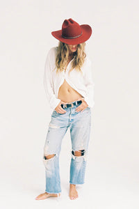 Reach new heights in The Ridge Special – Merlot. The sky’s the limit in our new western Ridge style, an ode to vintage Western films. Crafted from 100% Australian wool in a rich merlot tone, with a leather & stud band detail.