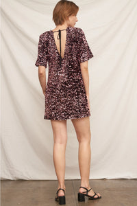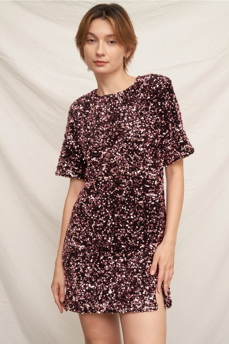 Short sleeve sequin mini dress with back tie.