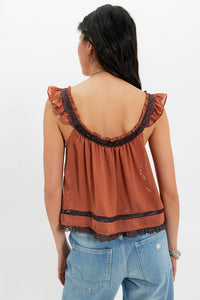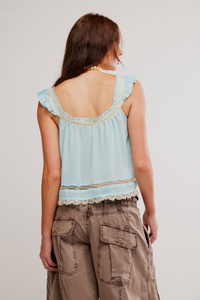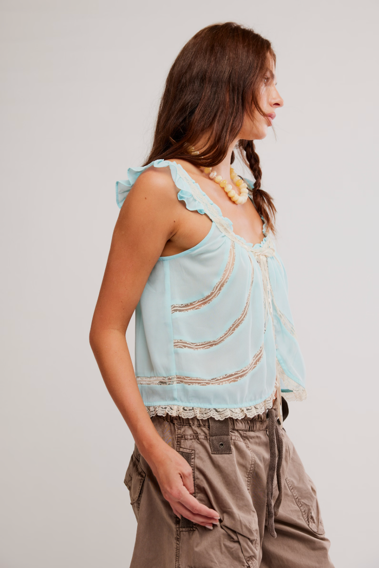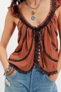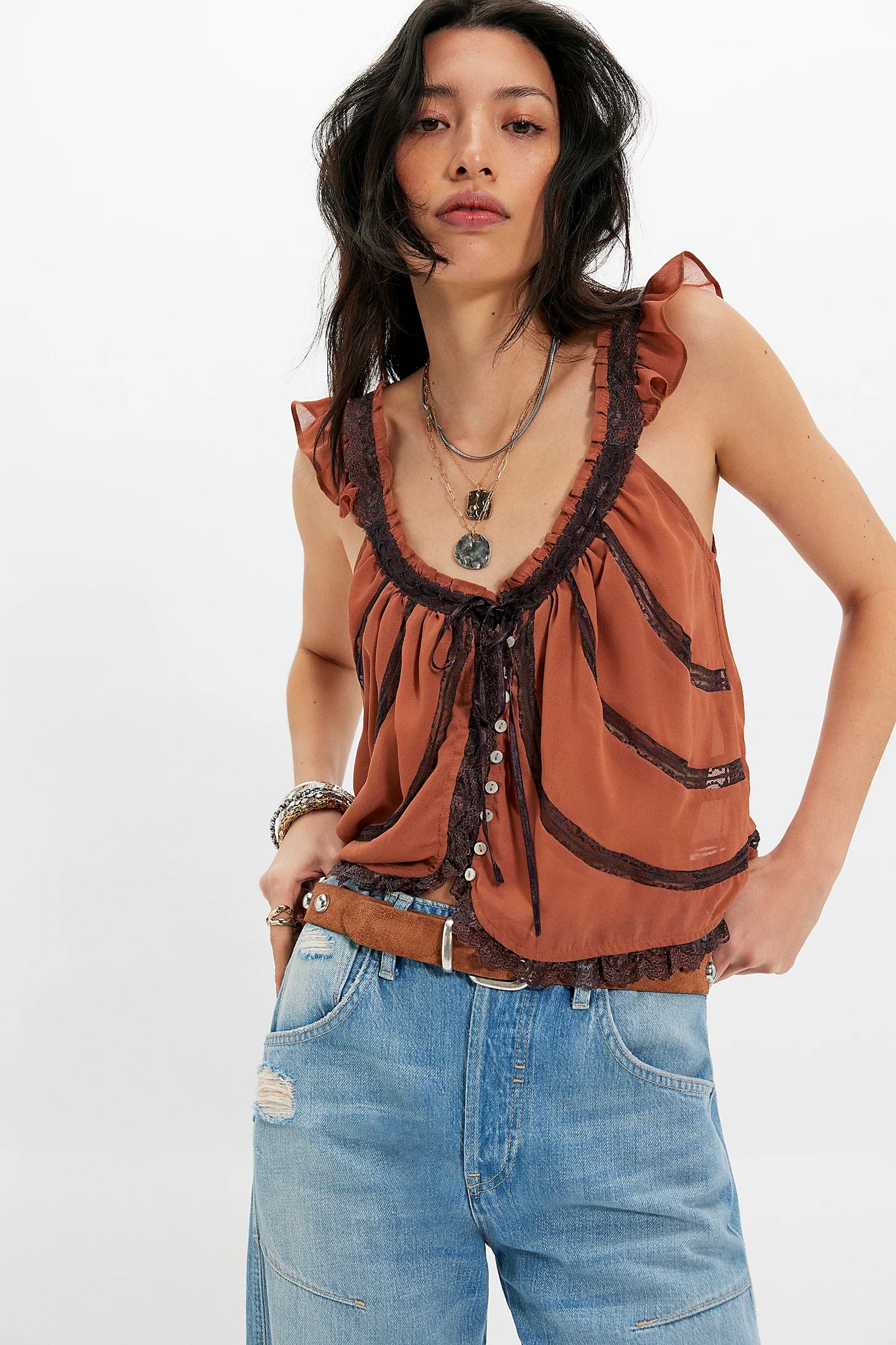 Forever femme and vintage-inspired, this delicate tank features a lightweight fabrication, dainty lace panels, and a breezy silhouette for an effortless feel. Scoop neckline, ruffled trim, button-front closure, tie detail at neck.