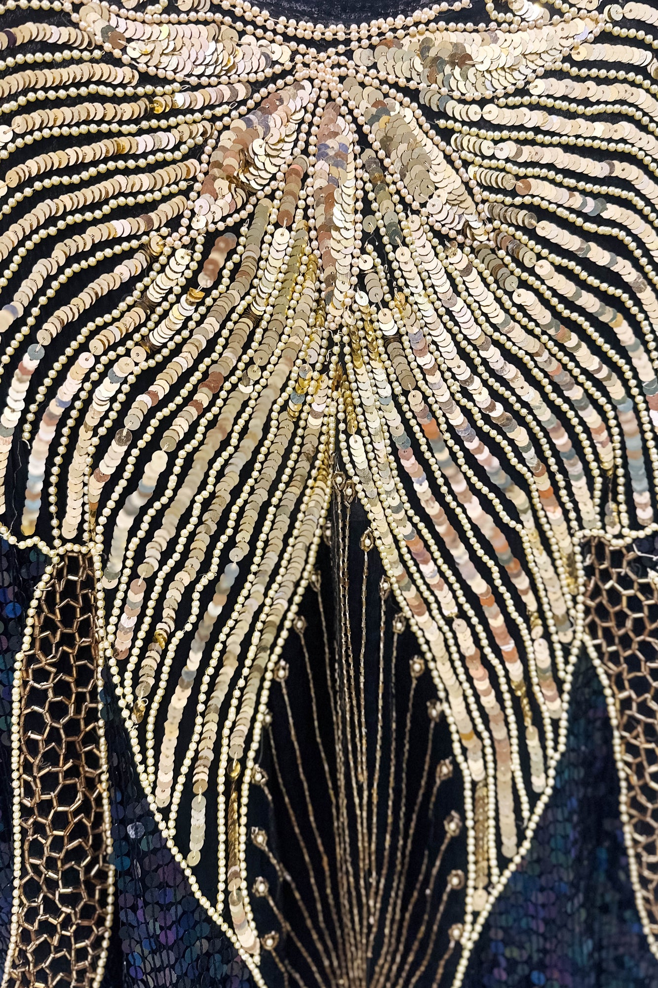 Dazzle in this vintage black sequin top featuring a bold gold Art Deco-style design. With intricate hand-beading and shimmering sequins, this statement piece is perfect for evening wear, special occasions, or adding retro flair to your modern wardrobe. Boxy silhouette with short sleeves. Fully lined with shoulder pads for structure. Pullover style with no closures.
