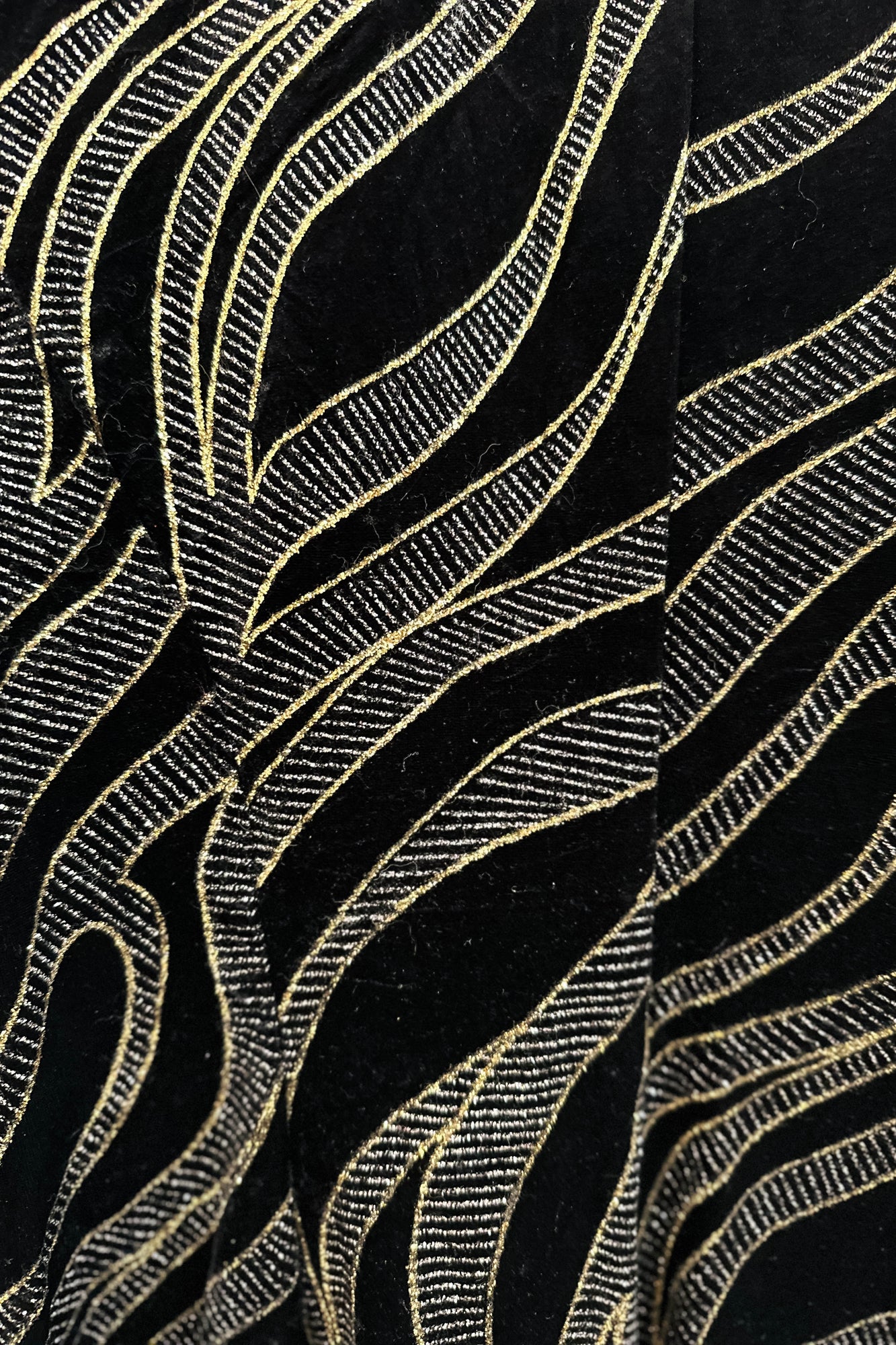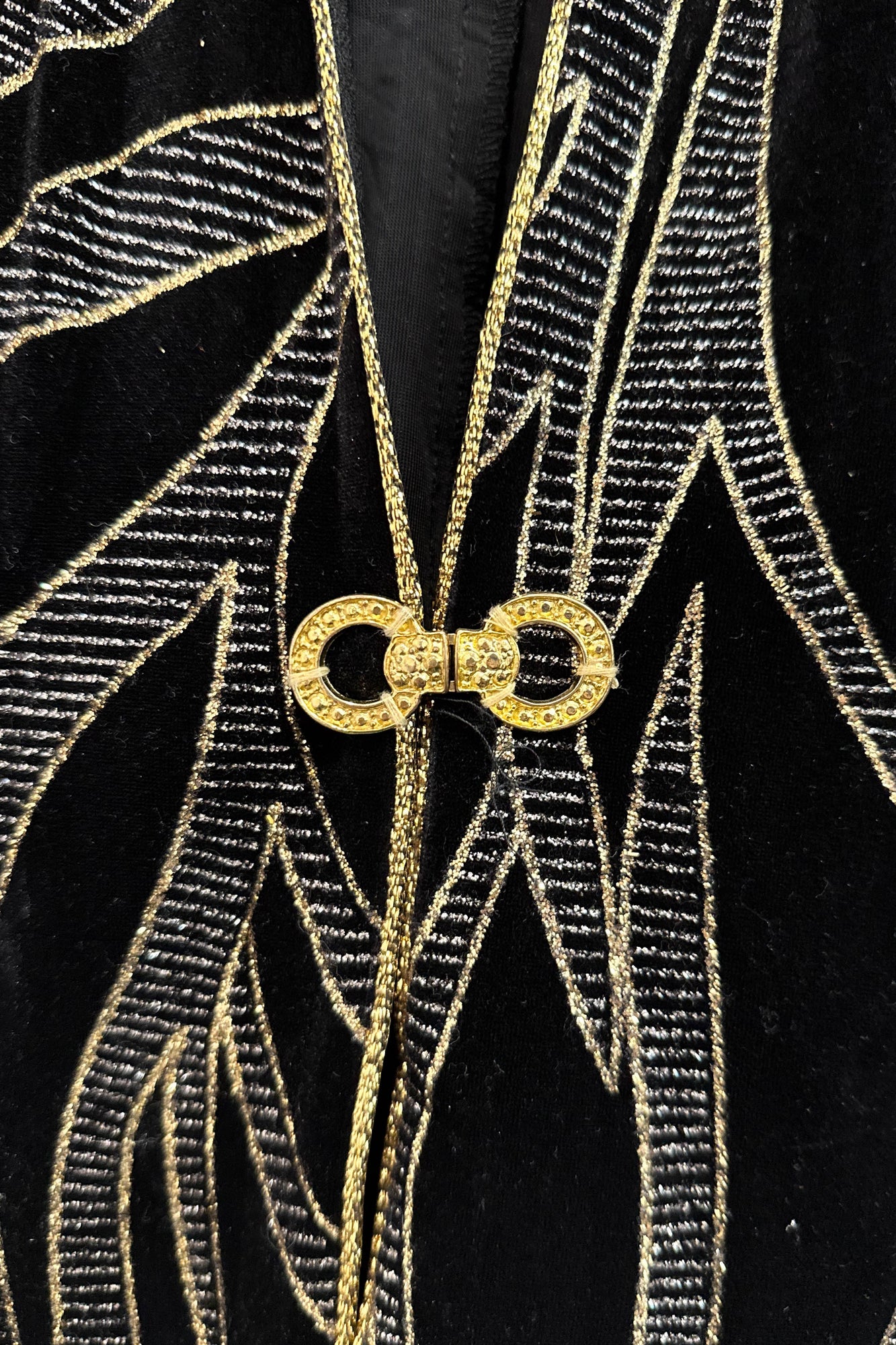 Crafted in the USA, this sophisticated blazer features a luxurious black velvet base with dazzling metallic gold and silver embroidery in an abstract, flowing pattern. Shoulder pads for a flattering, structured silhouette. A deep V-neckline with a sleek, open-front design accented by a gold double-ring clasp at the waist.