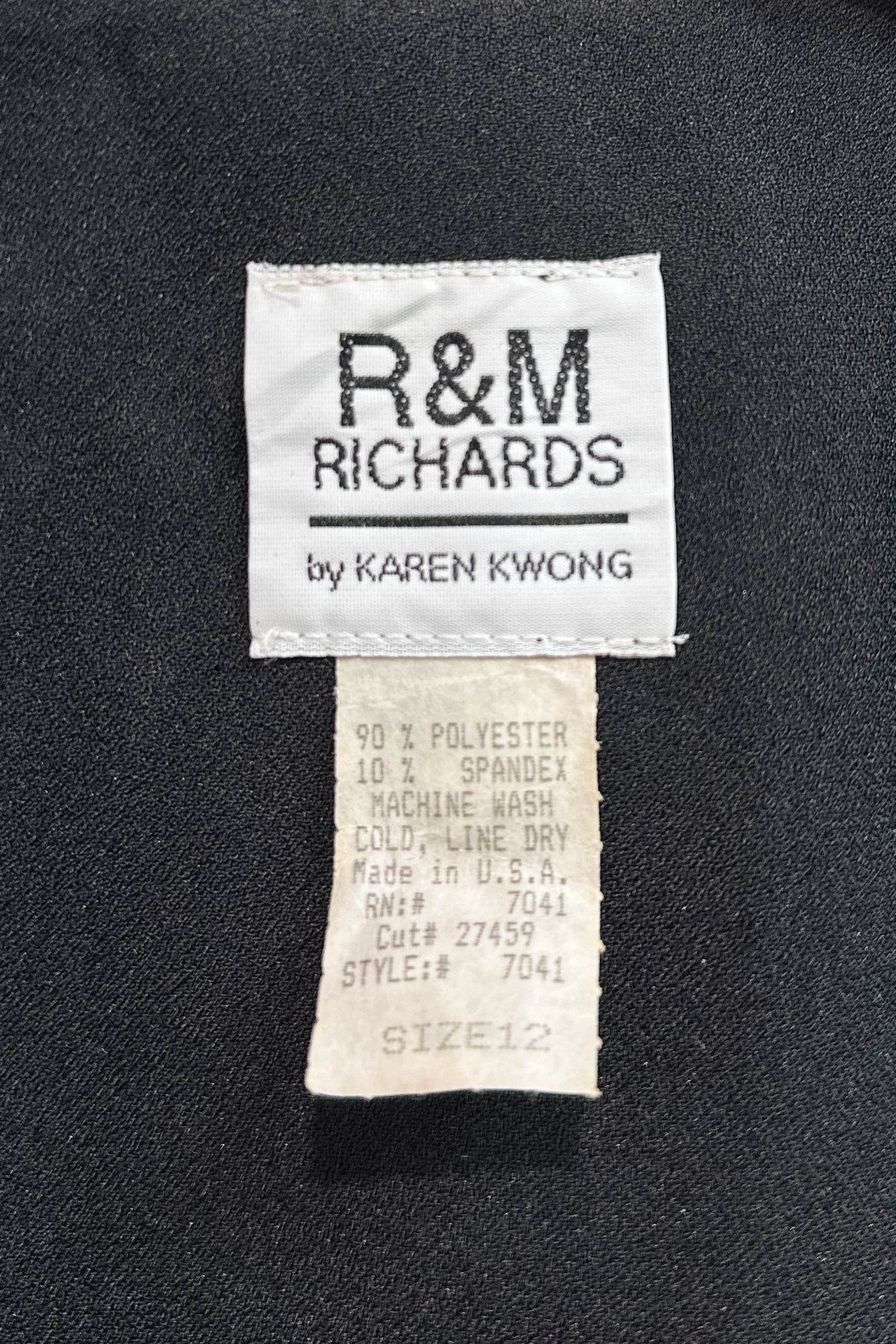 Turn heads with this striking vintage black velvet blazer by R&M Richards by Karen Kwong, a glamorous piece from an era of bold fashion and timeless elegance.