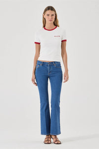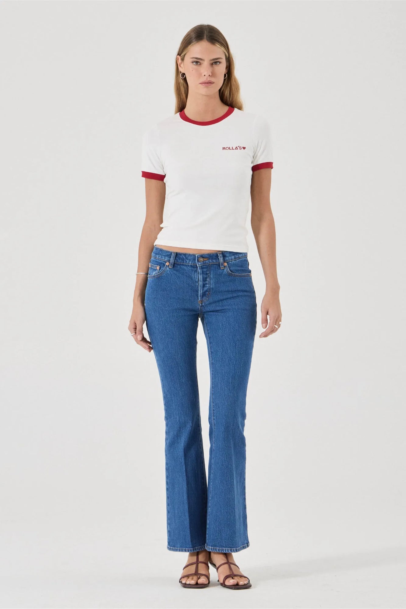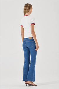 This is a low-rise flared jean, made with comfort stretch denim. Canyon Stone is a vintage inspired stone wash, features Rolla's large leather patch