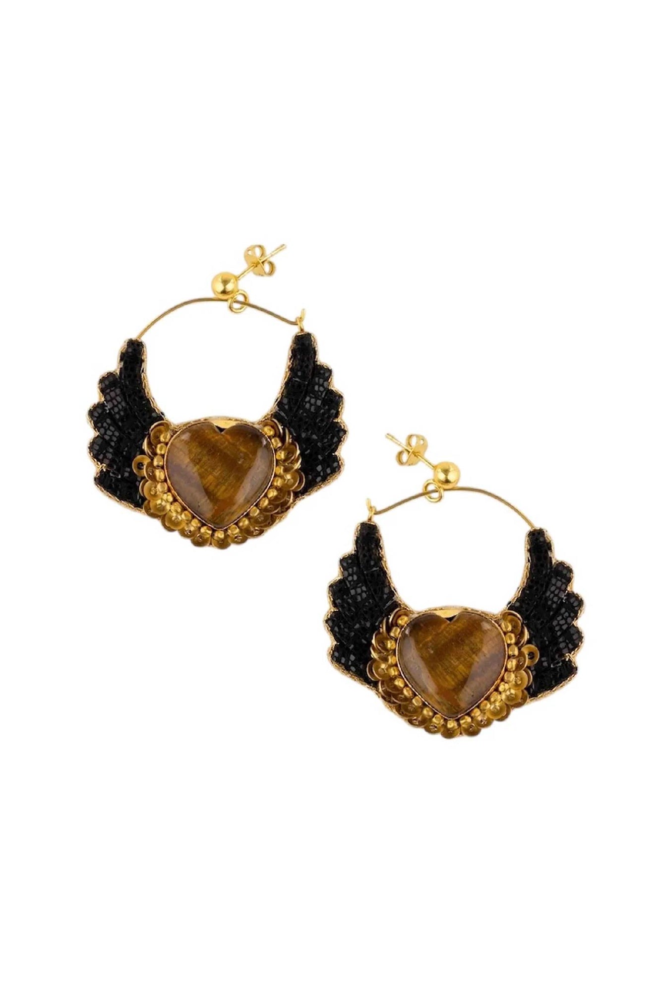 Hoops earrings hand-embroidered with silk thread, set with a semi-precious stone and brass beads. Leather lining, stainless steel and anti-allergenic brass fasteners.