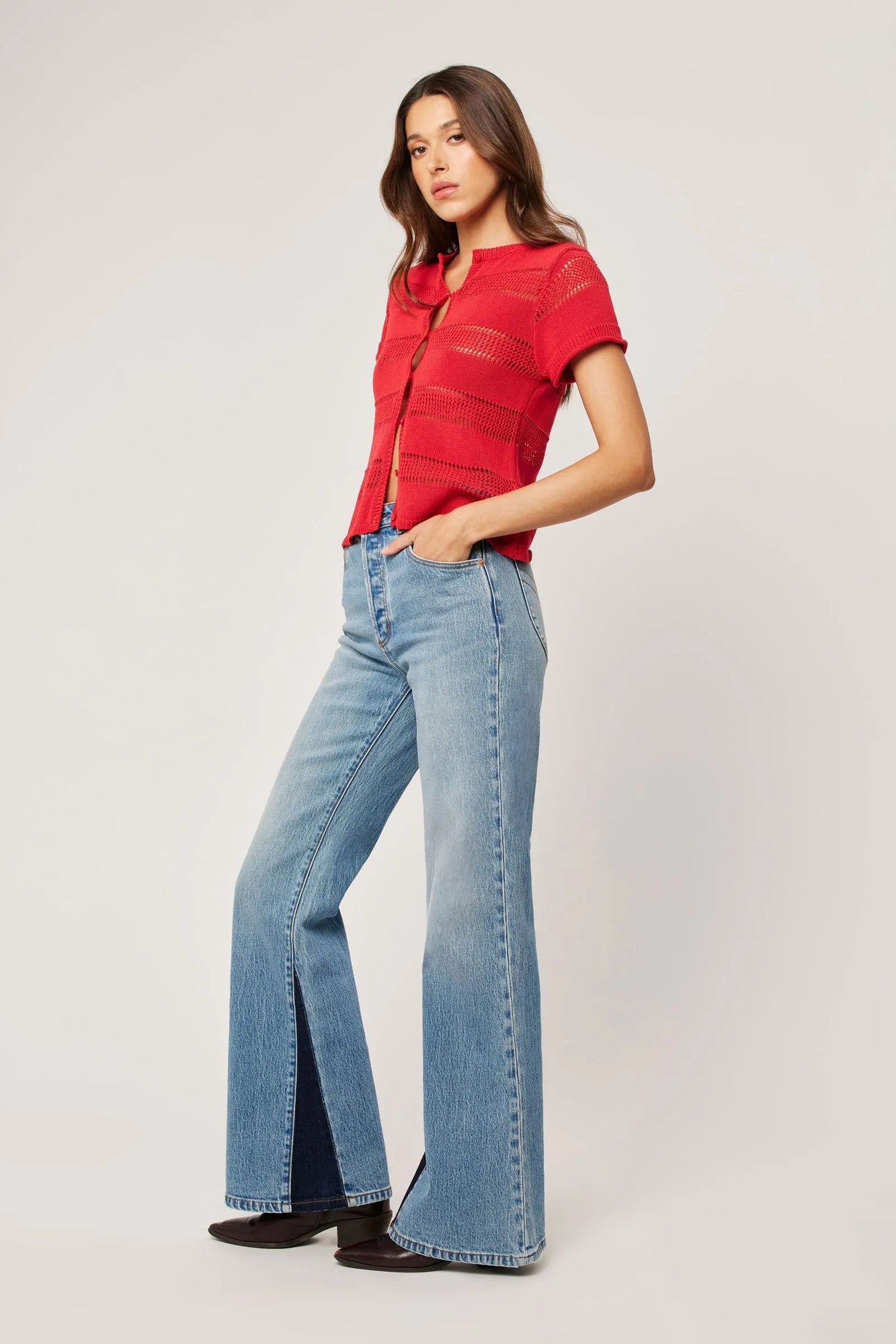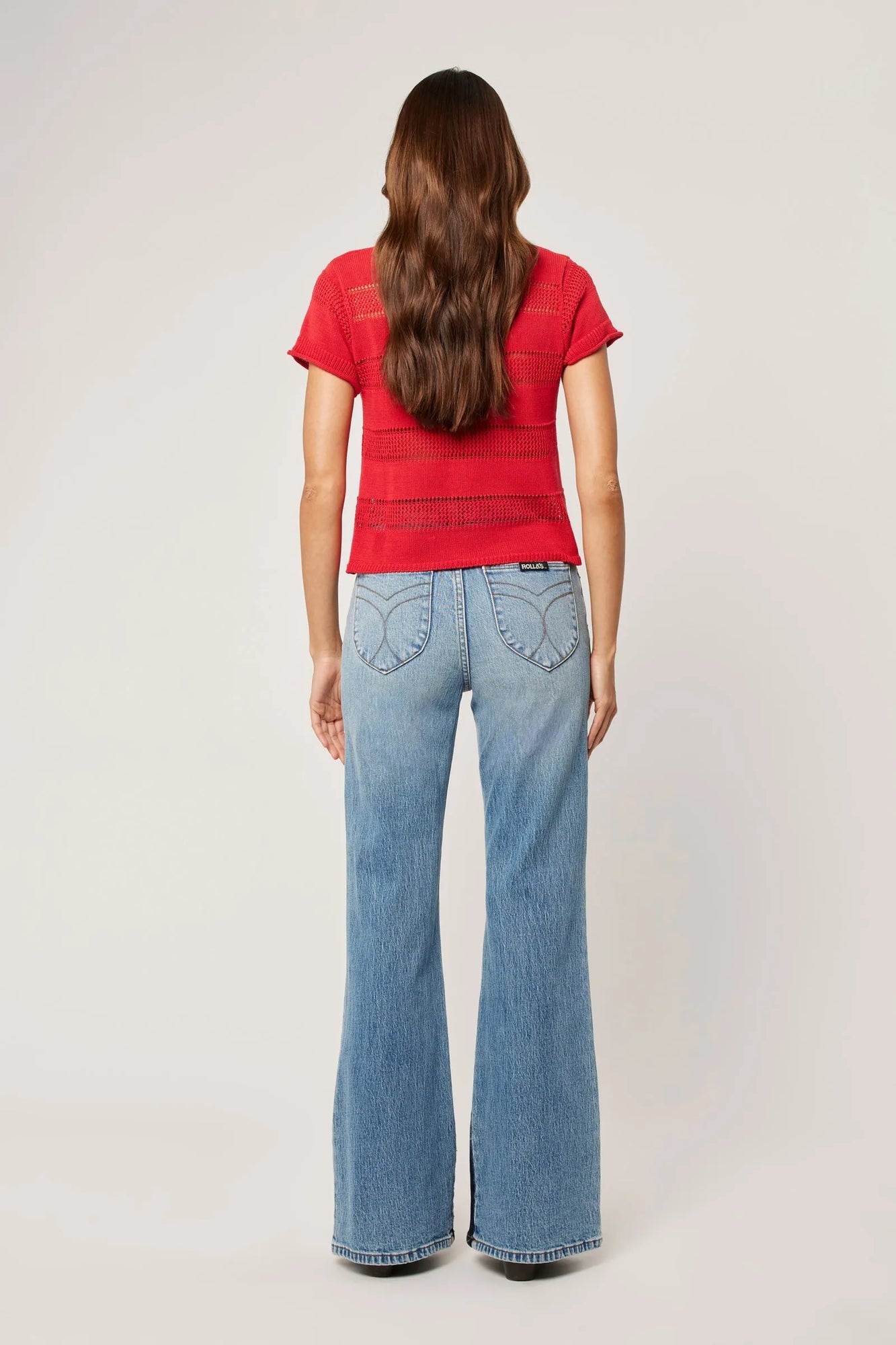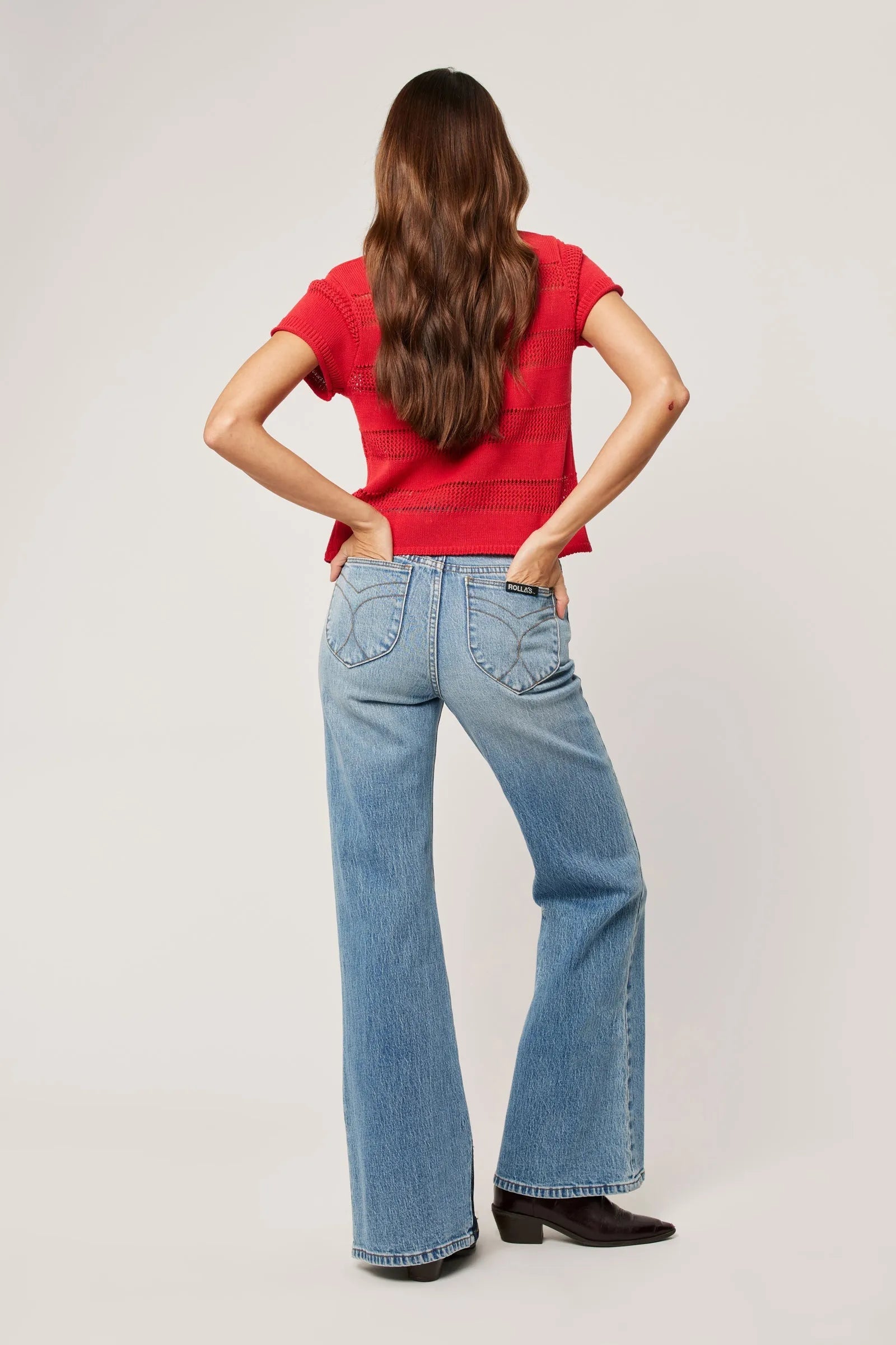 Rolla's iconic fit - a high rise, slim fit flare. Specially angled and shaped in the back for a truly peachy looking butt. Button closure and full length leg. Made with Rolla's signature vintage-toned button and trims. Crafted from a premium super stretch denim that holds its shape.