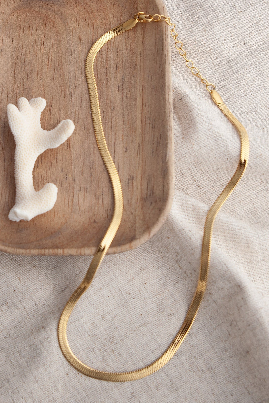 Our Kennedy Chain is a smaller version of our Avery chain. It is a classic flat snake chain design and is finished at an adjustable length of 16"-18".