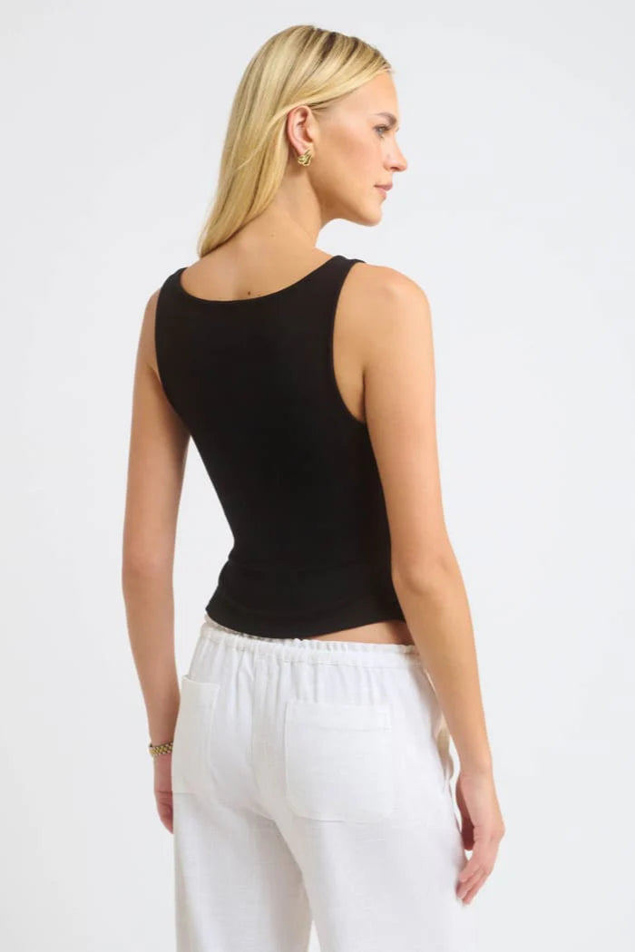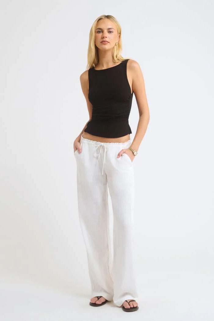 The kind of top you'd find in a suitcase packed for a summer on the road—somewhere between Jane Birkin’s drawer and a desert thrift score. The Klein Tank is cut in a slinky rib knit with a wide boatneck, subtle side vents, and shirring at the waist that flatters without trying too hard. It clings just right, like it’s been worn in by sunlight and slow living.