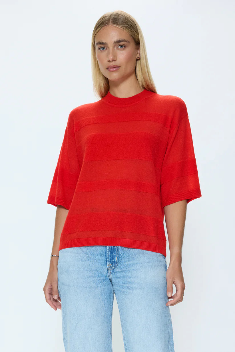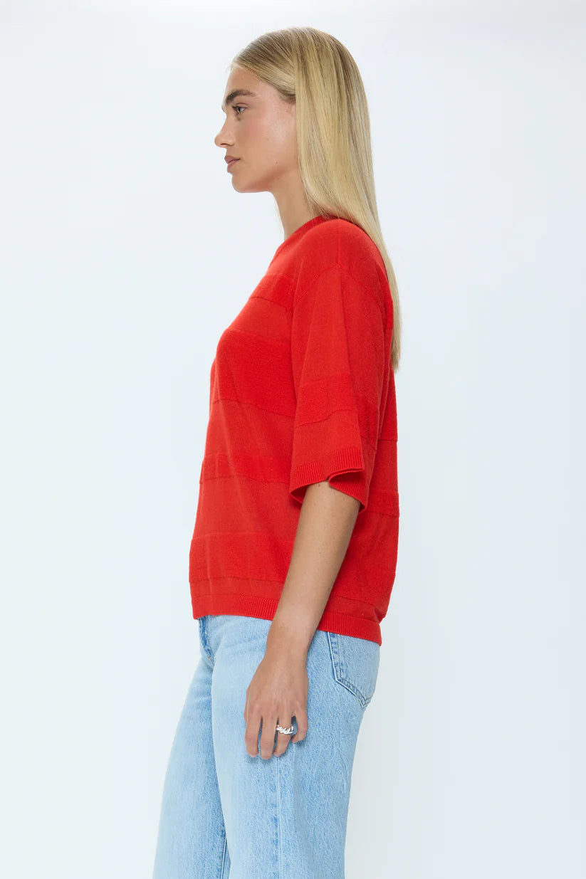 The classic short sleeve sweater silhouette gets a modern reimagining for Spring in a featherweight knit that feels airy yet structured. Designed with a classic crew neckline and slightly boxy shape, this transitional layer is a foundational piece with softly striped detailing. In a bright cherry red, Tarra styles seamlessly with your favorite denim, taking each look to the next level.